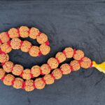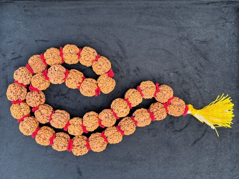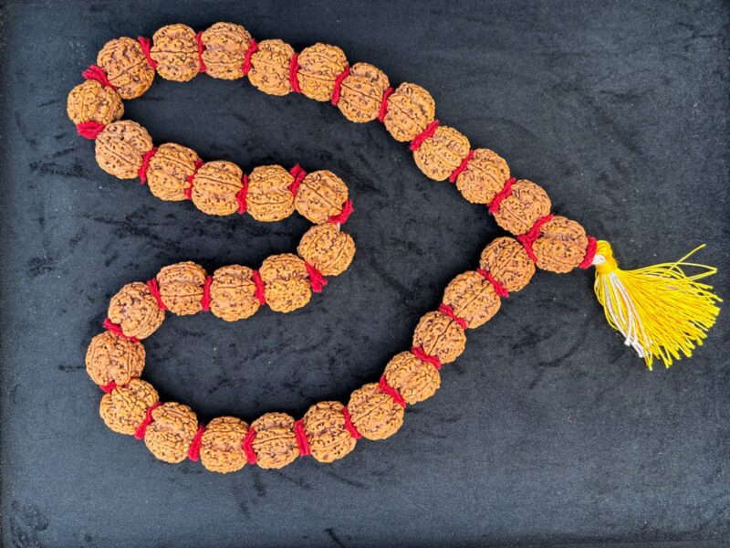 This mala is made up of 5 mukhi Nepalese Rudrakshas of 36 + 1 beads. A five Mukhi Rudraksha has 5 natural lines on its surface. The ruling deity of this Rudraksha is Lord “Kalagni” – a form of Lord Shiva. This is a most commonly found Rudraksha & it destroys the “Bad Karmas” of the present life, thereby making the wearer pure and his mind become peaceful and calm. 5 mukhi Rudraksha is said to remove sins of various kinds which have been committed by a person in the present life. 5 mukhi Rudraksha has been highly regarded in Ancient Texts and Scripts and it has been given the status of “Dev Guru Rudraksha” because of the fact that its ruling planet is Jupiter who is the Guru of Gods. 5 mukhi Rudraksha also protects a person from Accidental Deaths and it is also very important in any kind of Saadhna or Meditation. A 5 mukhi Rudraksha Kantha mala also gives a person Name, Fame and Mental Peace.